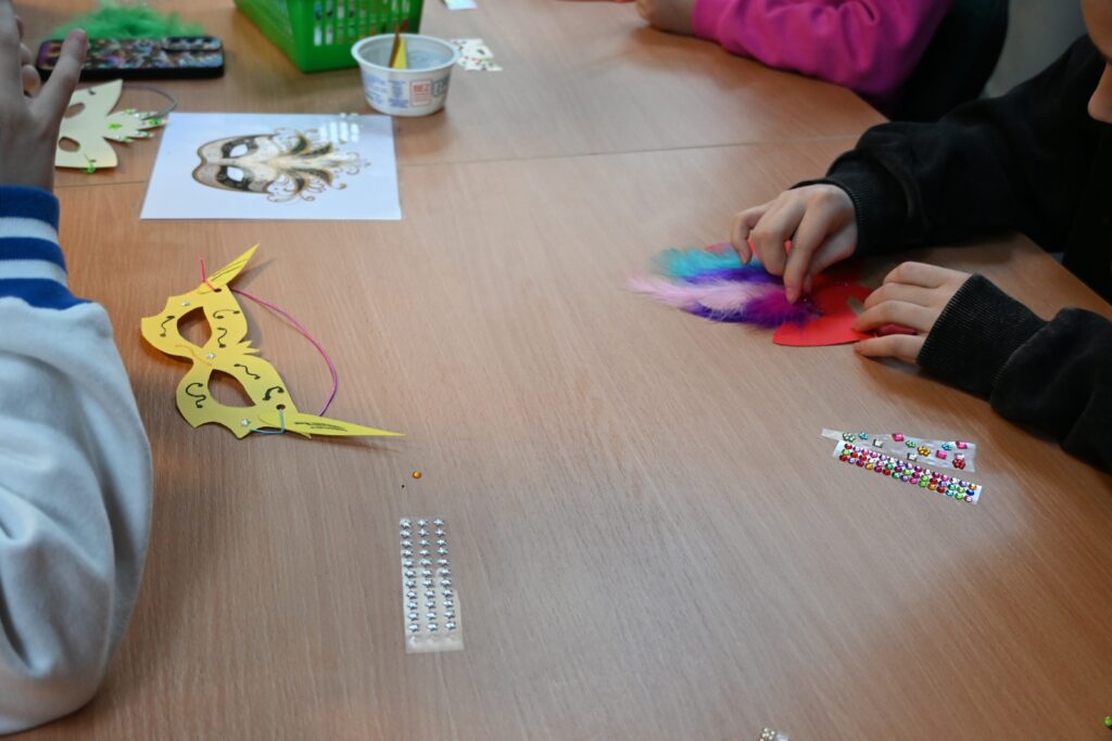 Podczas spotkania rozmawialiśmy z uczniami o tradycjach karnawałowych w Polsce i na świecie. Dzieci miały okazję obejrzeć weneckie maski karnawałowe, które następnie samodzielnie wykonały i ozdobiły kolorowymi piórkami, cekinami oraz brokatem. W kolejnej części zajęć mali artyści zaprezentowali swoje prace, a następnie w rytmach samby rozpoczęliśmy radosną zabawę taneczną.