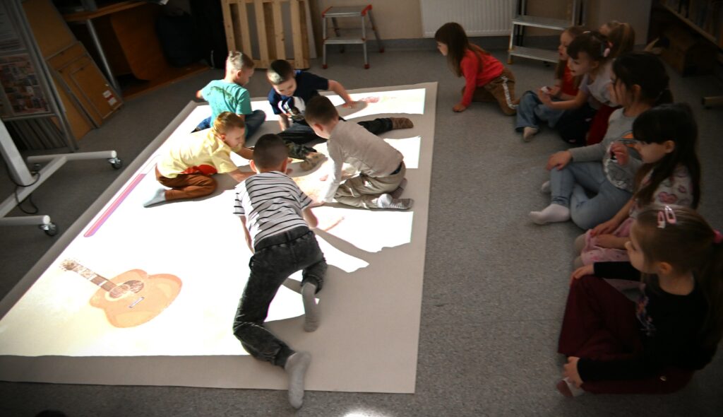 Grupa pięciolatków i sześciolatków z Przedszkola Niepublicznego „Klub Malucha” odwiedziła dziś bibliotekę i spędziła u nas wyjątkowo radosne chwile. Dzieci miały ogromną przyjemność bawić się na interaktywnej podłodze FunFloor, która dostarczyła im mnóstwo ruchu, śmiechu i pozytywnych emocji. Zabawy były nie tylko świetną rozrywką, ale także okazją do ćwiczenia refleksu, spostrzegawczości i współpracy.