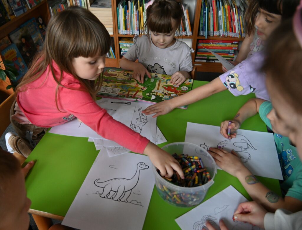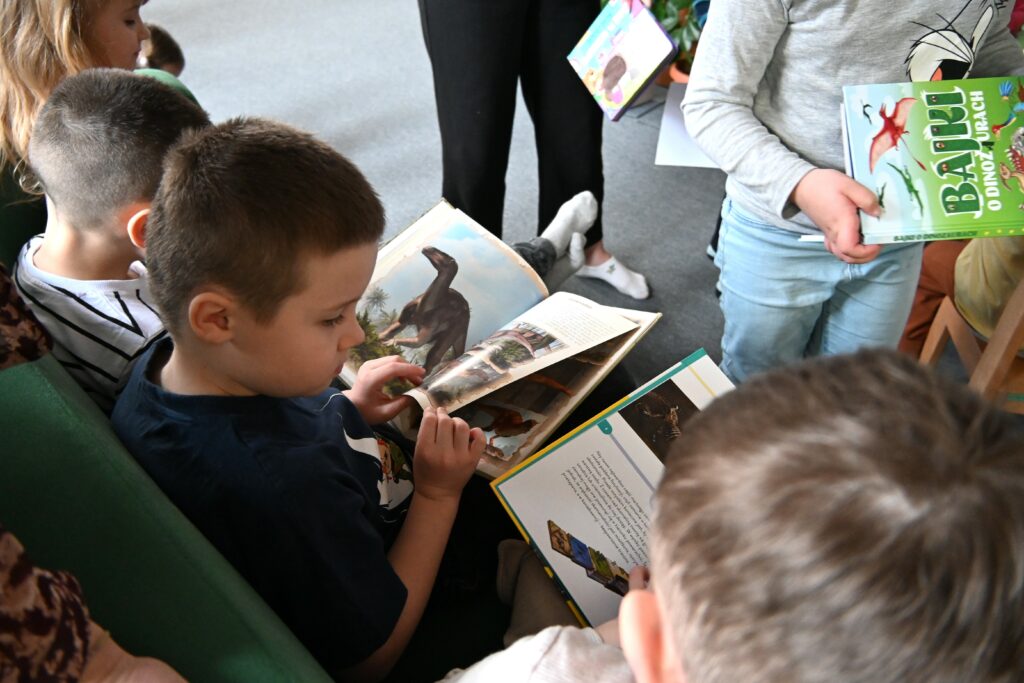 W trakcie wizyty mali goście obejrzeli również naszą wystawę książek o dinozaurach. To wspaniale się złożyło, ponieważ w przedszkolu trwa właśnie tydzień tematyczny poświęcony tym prehistorycznym stworzeniom. Dzieci z zainteresowaniem oglądały kolorowe publikacje, dzieliły się swoją wiedzą i z entuzjazmem opowiadały o ulubionych gadach sprzed milionów lat.