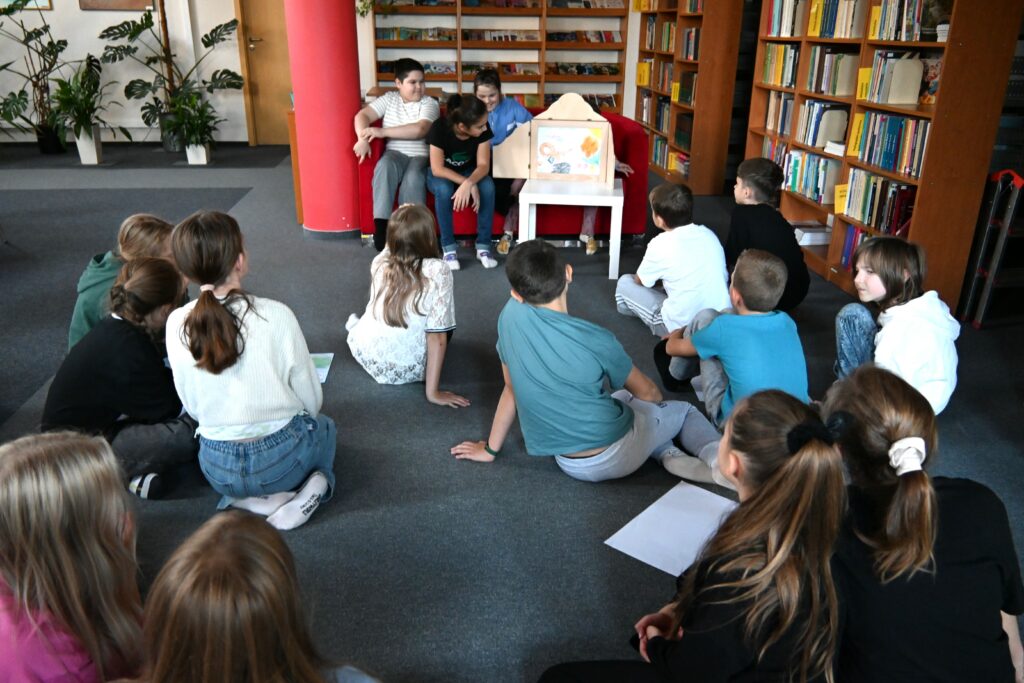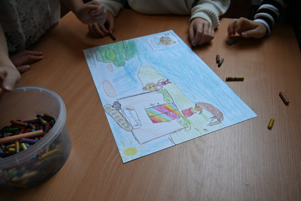 W drugiej części zajęć uczniowie pracowali w grupach, tworząc własne opowieści inspirowane historią lwa. Dzieci samodzielnie wykonały ilustracje i zaprezentowały swoje opowieści w formie teatrzyku kamishibai.