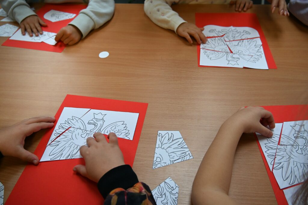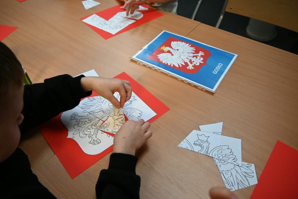 Na zakończenie zajęć przedszkolaki wykonały pracę plastyczną – z przygotowanych puzzli ułożyły obrazek przedstawiający godło Polski, przykleiły go na czerwonym tle i pokolorowały.