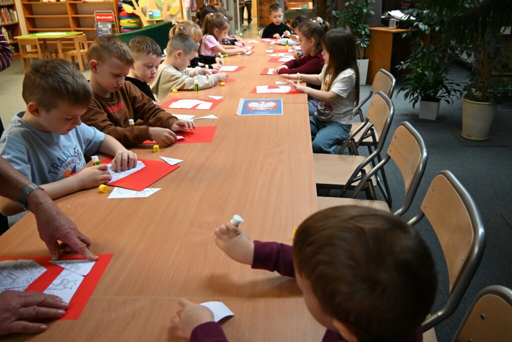 Spotkanie rozpoczęło się od obejrzenia i wysłuchania teatrzyku kamishibai pt. „Niepodległa 11 listopada”, który wprowadził najmłodszych w tematykę odzyskania przez Polskę niepodległości. Następnie rozmawialiśmy o tym, czym jest wolność i niepodległość oraz jakie znaczenie mają nasze narodowe symbole: flaga, godło i hymn. Dzieci wysłuchały piosenki „Flaga biało-czerwona”, a następnie, w postawie na baczność, zaśpiewały „Mazurek Dąbrowskiego”.