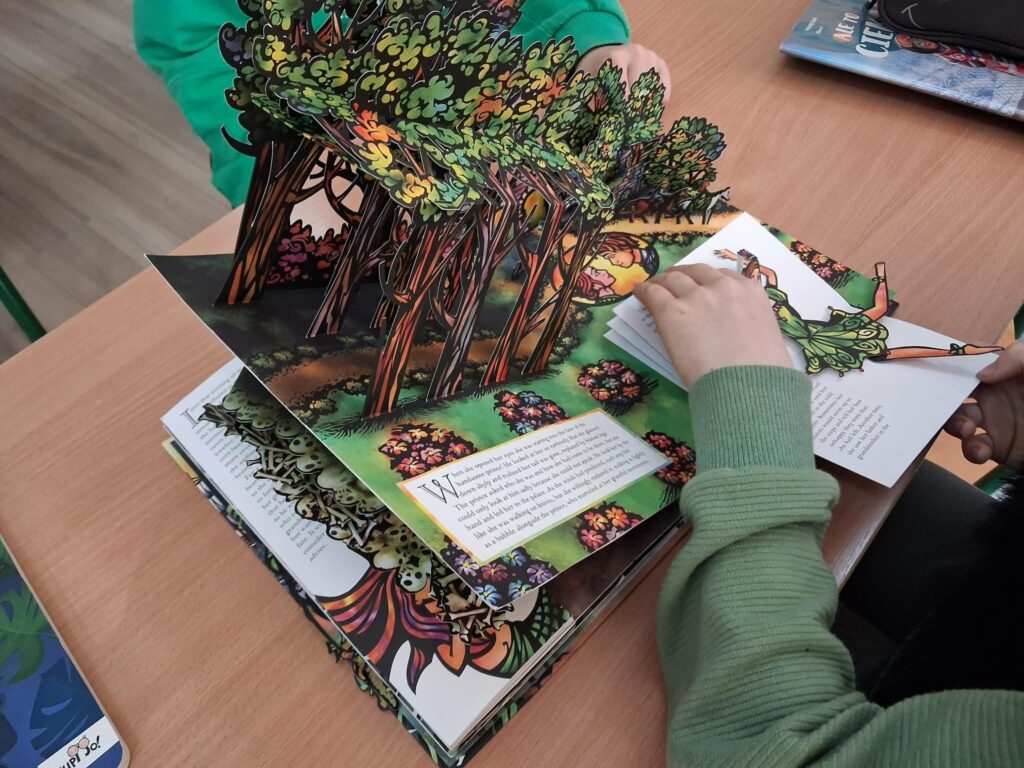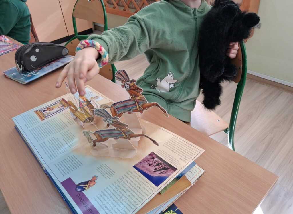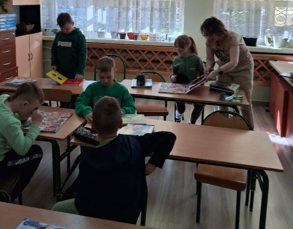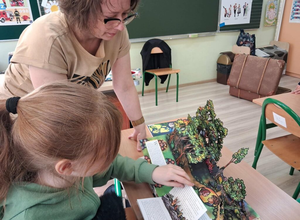 Kolejnym punktem zajęć było oglądanie różnorodnych książek interaktywnych. Dzieci zastanawiały się, czym różnią się one od tradycyjnych książek z tekstem linearnym. Miały niepowtarzalną okazję zobaczyć, dotknąć, a nawet usłyszeć książki wyposażone w otwierane okienka, ruchome i wyskakujące elementy oraz efekty dźwiękowe. Zajęcia wzbudziły duże zainteresowanie i radość wśród uczniów, pokazując, że książka może być nie tylko źródłem wiedzy, ale także wspaniałą formą zabawy i odkrywania świata.